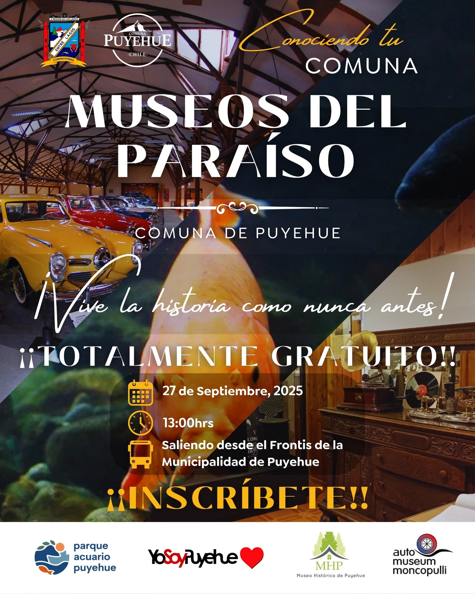 PUYEHUE¡Vive Puyehue como nunca antes! ¿Listo para una aventura cultural inolvidable?El Departamento de Turismo, Fomento Productivo, Medio Ambiente y Cultura te invita a recorrer tres joyas de nuestra comuna: Museo Histórico de Puyehue Parque Acuario Lago Puyehue Automuseo MoncopulliUna experiencia gratuita para reconectar con nuestra historia, naturaleza y patrimonio. ¡Ideal para curiosos, amantes de la cultura y exploradores locales! Es una actividad gratuita y los cupos son limitados Inscripciones abiertas hasta el viernes 26 de septiembre a las 13:00hrs Inscríbete de forma presencial en el Departamento de Turismo, en las dependencias de la Casa de las Organizaciones (lleva tu Registro Social de Hogares para confirmar residencia)Solo debes cumplir con: Ser mayor de 15 años (Personas de 15 a 17 años deben asistir con un adulto responsable) Ser residente de la comuna de Puyehue¡No te quedes fuera! Descubre, aprende y disfruta #TurismoPuyehue #MuseosConHistoria #CulturaLocal #ExploraPuyehue #PatrimonioVivo #yosoypuyehue