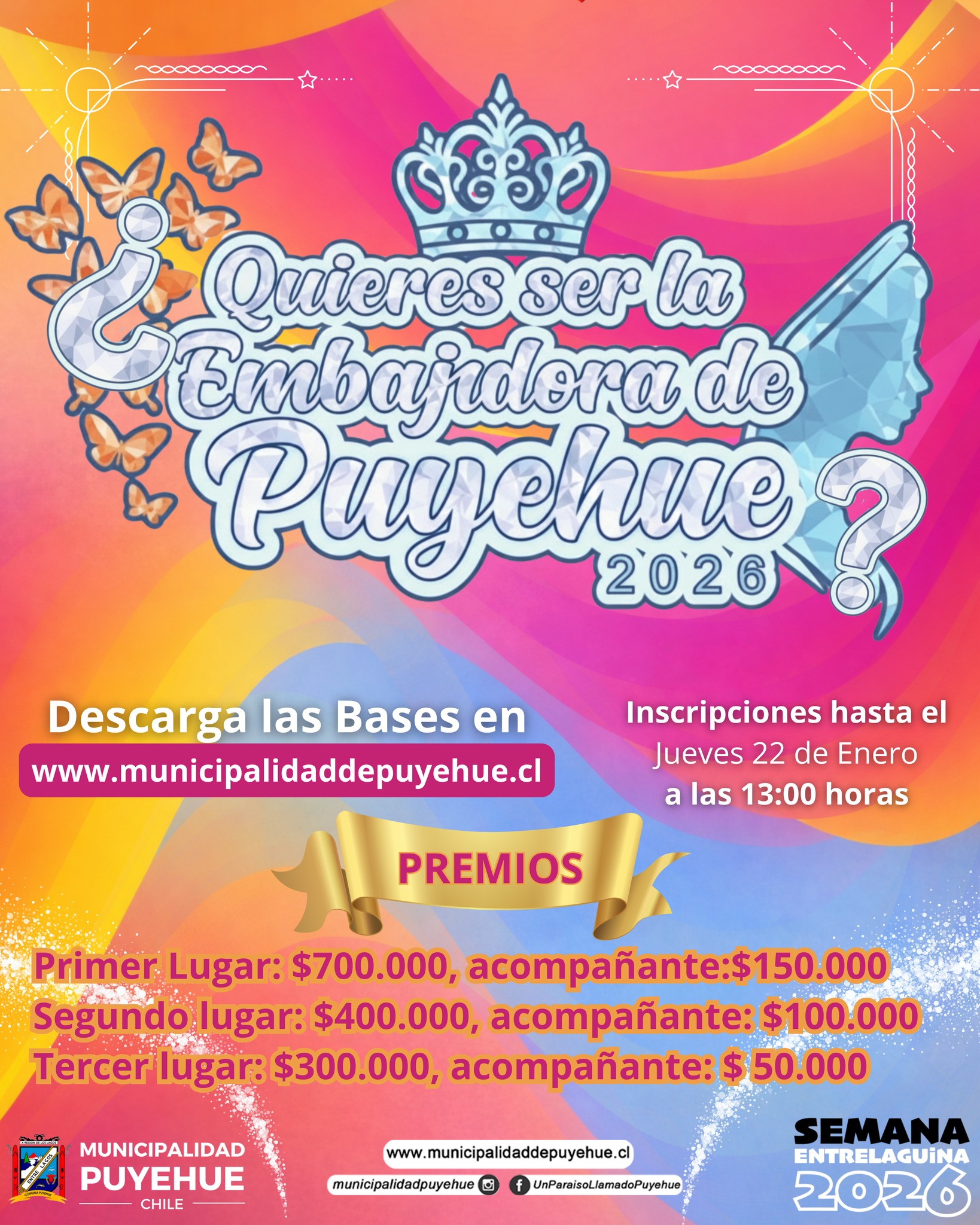 OFICINA LOCAL DE LA NIÑEZ DE PUYEHUE Tomas glaves Wilson 2, Entre Lagos, Osorno, Chile#Puyehue ¿𝐐𝐔𝐈𝐄𝐑𝐄𝐒 𝐑𝐄𝐏𝐑𝐄𝐒𝐄𝐍𝐓𝐀𝐑 𝐀 𝐓𝐔 𝐂𝐎𝐌𝐔𝐍𝐀 𝐘 𝐒𝐄𝐑 𝐏𝐀𝐑𝐓𝐄 𝐃𝐄 𝐋𝐀 𝐇𝐈𝐒𝐓𝐎𝐑𝐈𝐀 𝐃𝐄 𝐏𝐔𝐘𝐄𝐇𝐔𝐄? Si tienes actitud, compromiso y amor por tu territorio, esta es tu oportunidad Postula y conviértete en la Embajadora de Puyehue 2026, representando a nuestra comuna en el marco de la Semana Entrelaguina. Plazo de postulación: hasta el 22 de enero Revisa las bases y requisitos en: www.municipalidaddepuyehue.cl Atrévete, participa y vive una experiencia única. Puyehue te está buscando. COORDINA: OFICINA LOCAL DE LA NIÑEZ